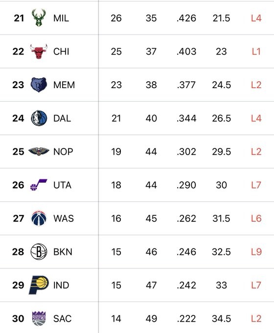 根据火箭媒体人Bradeaux统计,目前联盟最差的10支球队加起来已经44连败了。
