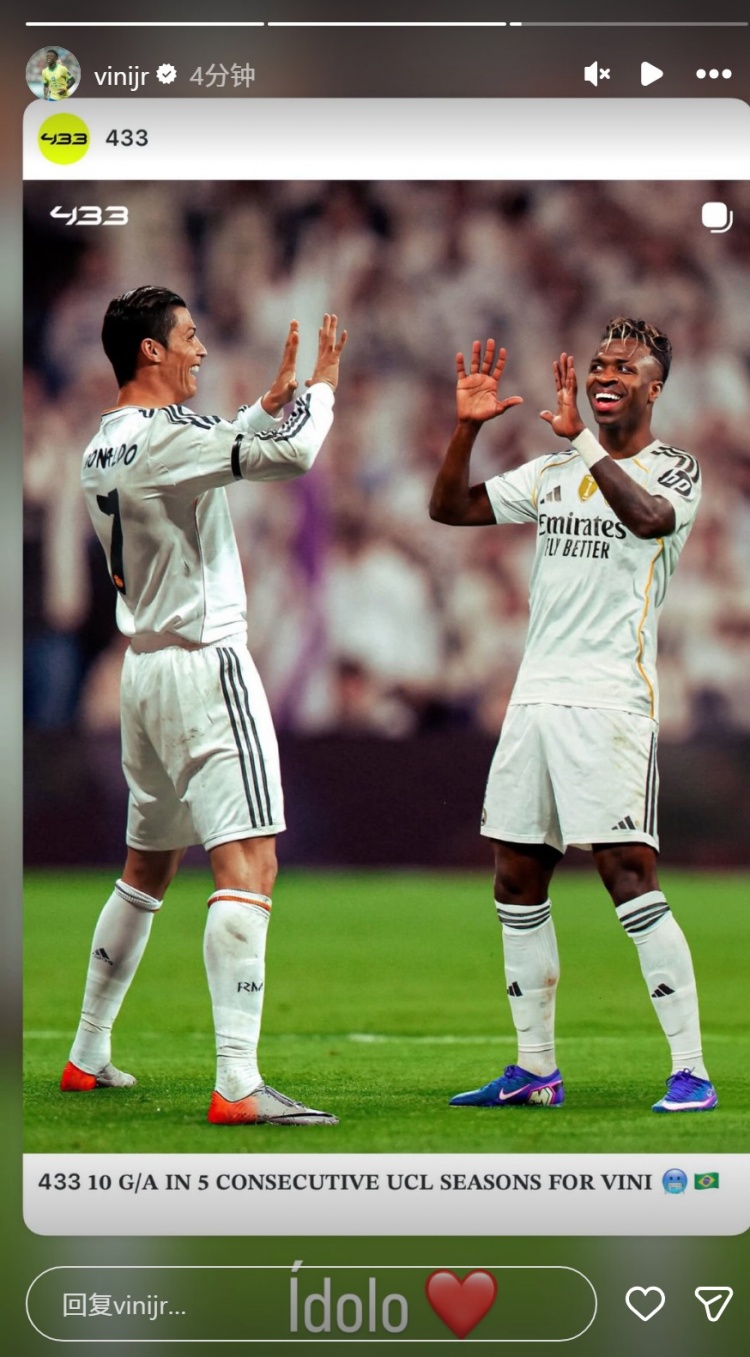 维尼修斯社媒转发433制作的他与C罗的同框图片,配文:“偶像。”