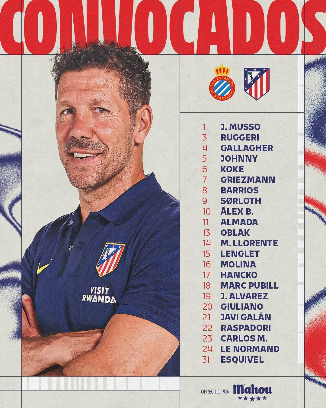 前锋:格列兹曼、瑟洛特、巴埃纳、胡利安-阿尔瓦雷斯、朱利亚诺-西蒙尼、拉斯帕多里、卡洛斯-马丁
